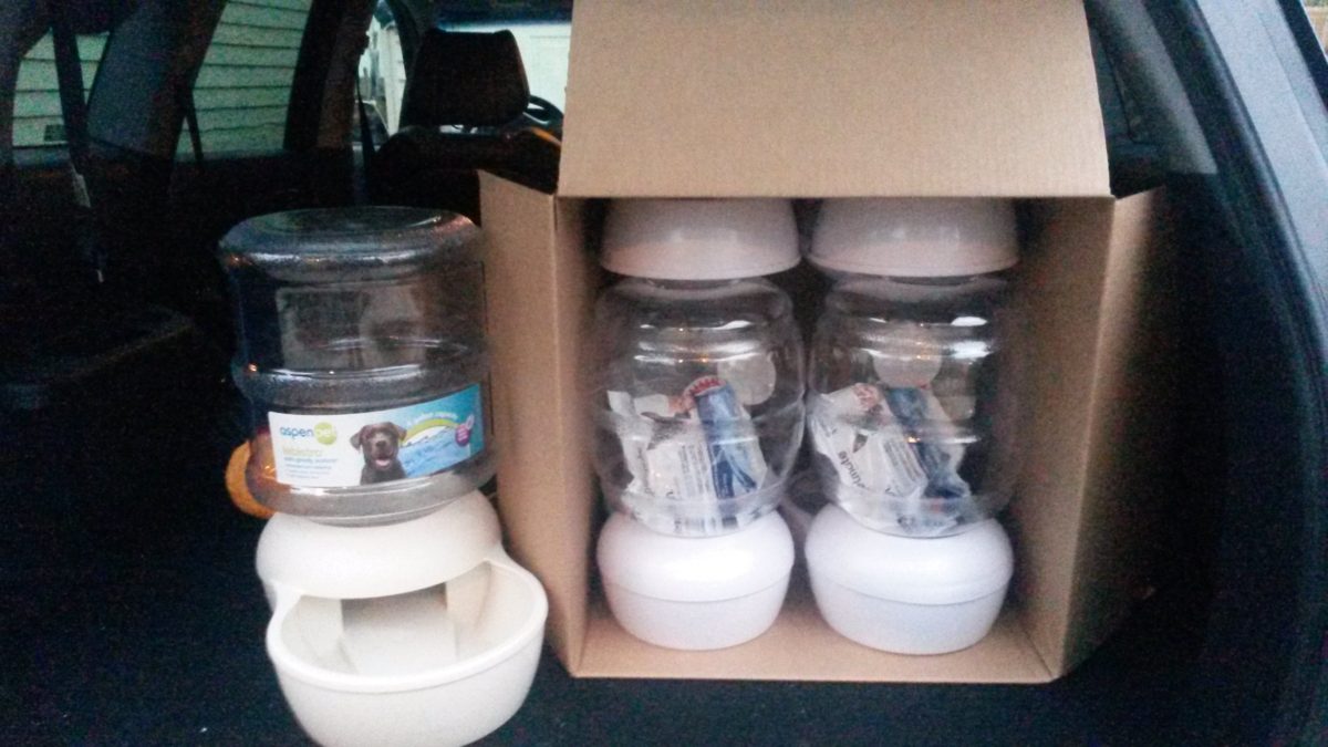 Now she starts filling our car UP! She donated 5 auto-watering systems. She said she wanted to pay it forward, as PetCo donated to BullyWag, Inc., however her dogs saw these as nothing more than toys. She wants to help other rescues.