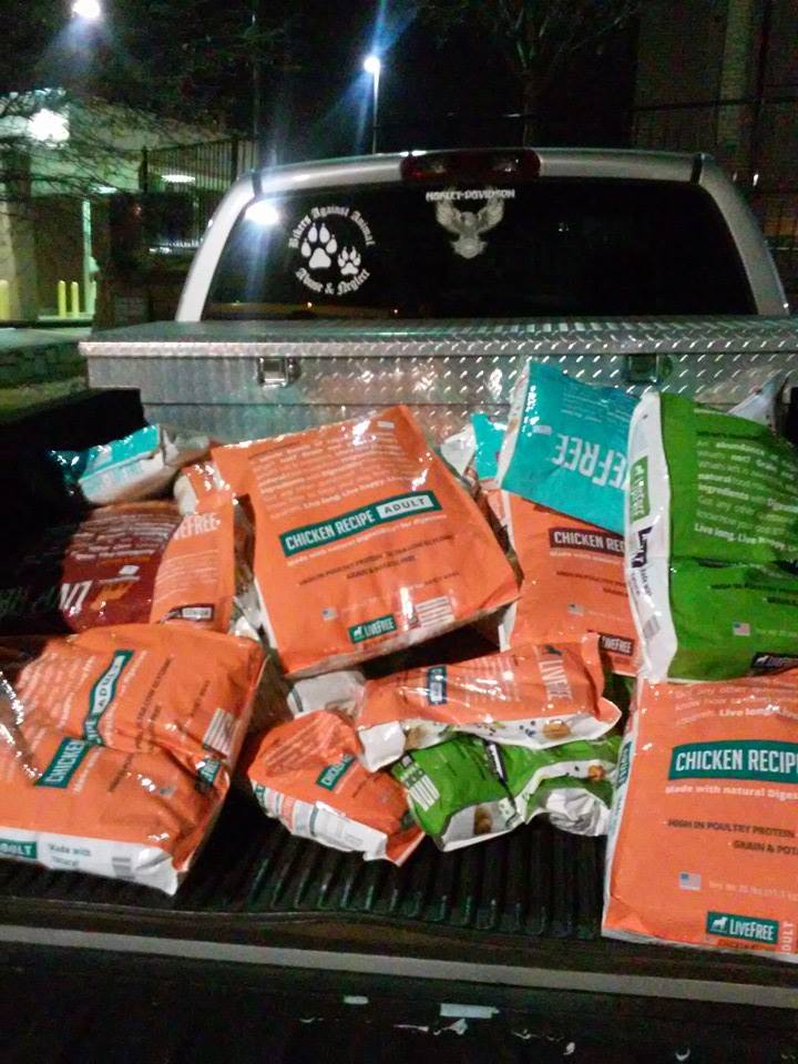 What a success! On all levels. Our new friendship has formed along with a mutual goal toward the same result. HELP. A phone call from Sassy Paws Pet Boutique and an individual donor, Elisa, resulted in 58 bags of food – in the same day. We delivered all of the food to Bikers Against Animal Abuse and Neglect, who will distribute among their rescue friends in need. Dean at BAAAN.org dropped his schedule to meet up within minutes of a call. And during the drive to meet, he was already on the phone with rescues in need for the mother load of food. We have some serious warm and fuzzies tonight!
