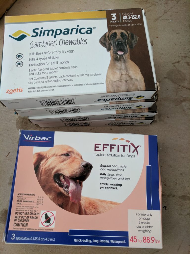 HUHA received 4 packs of Simparica for 88.1-132 pound dogs and 1 pack of Effitix for 45-88.9 pound dogs.