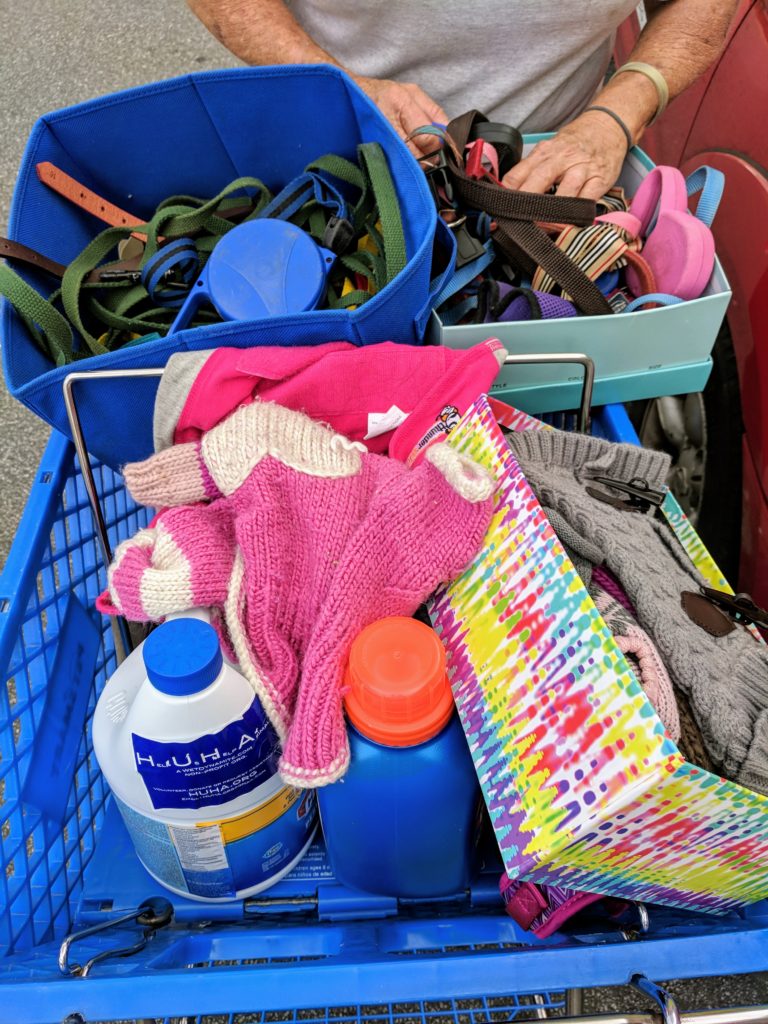 - boxes of leashes, harnesses, collars, sweaters and outfits