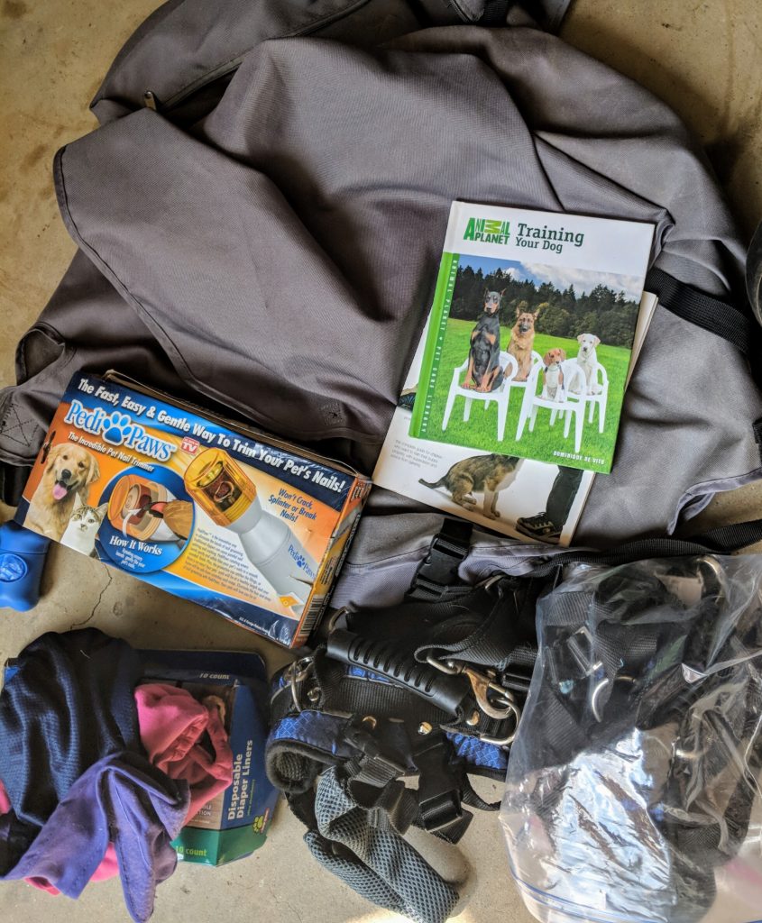 a couple of training books, a car hammock, a Pedi Paws nail tool, 2 poo bag holders, 2 service dog harnesses and disposable diaper liners. How awesome!