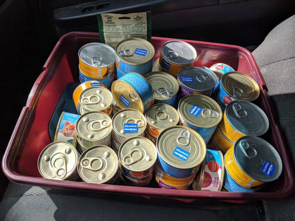 60 cans of cat food, a litter box, a couple of litter mats, a bag of pill pockets
