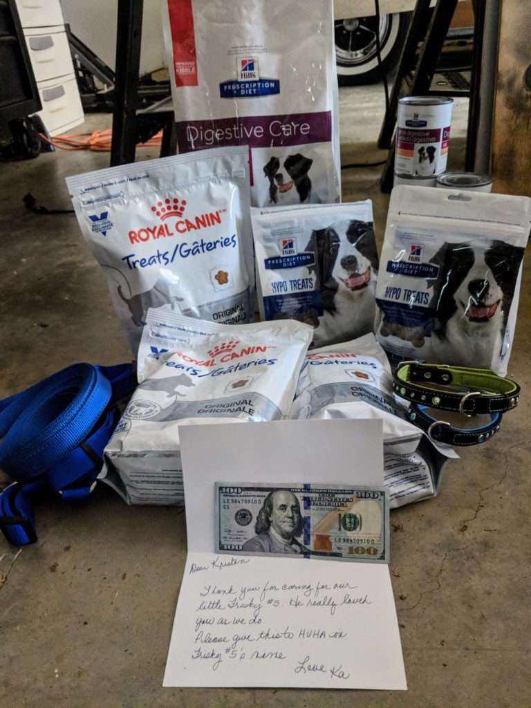 Frisky said goodbye to this world recently and with a final act of kindness, donated his food ( wet & dry ), treats, collars and leash to HUHA. He left us a wonderful card with $100 donation to HUHA so we can continue to help those that help his furry friends on a daily basis.