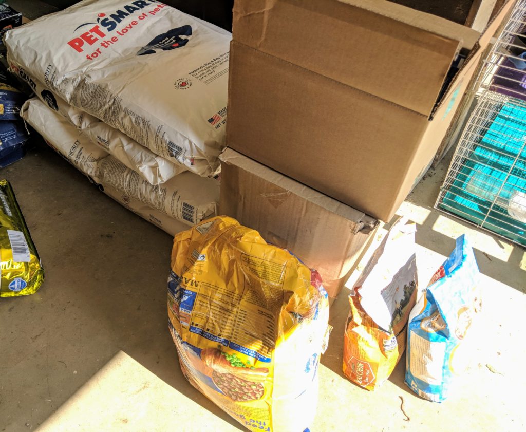 7 bags of dog food, 2 boxes of canned cat food and one box with treats and miscellaneous items