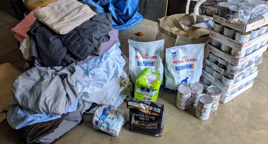 Last week Elaine donated a bunch of sheets, 6 cases of specialized canned dog food, 16 cans of specialized cat food, a pack of disposable male wraps, a small pack of puppy training pads, a large bag full of bandages and gauze and three bags of dry dog food. Thanks! #DonateHUHA