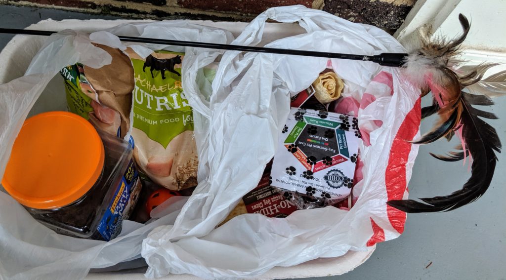 This morning HUHA received some cat toys, cat treats, a bag of cat food, some no hide bones, a recyclable litter box and some dog treats from Larry at Benbrooke LN! Thanks Larry! #DonateHUHA
