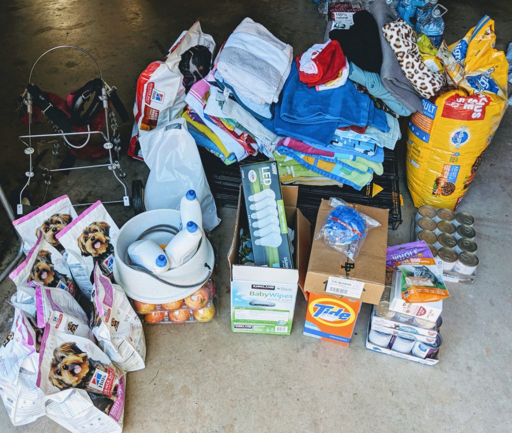 One large crate, laundry detergent, two stacks of towels, wet wipes, homemade wheelchair, two cases of canned cat food, harness, case of canned dog food, bag dog food, 4 bags cat food